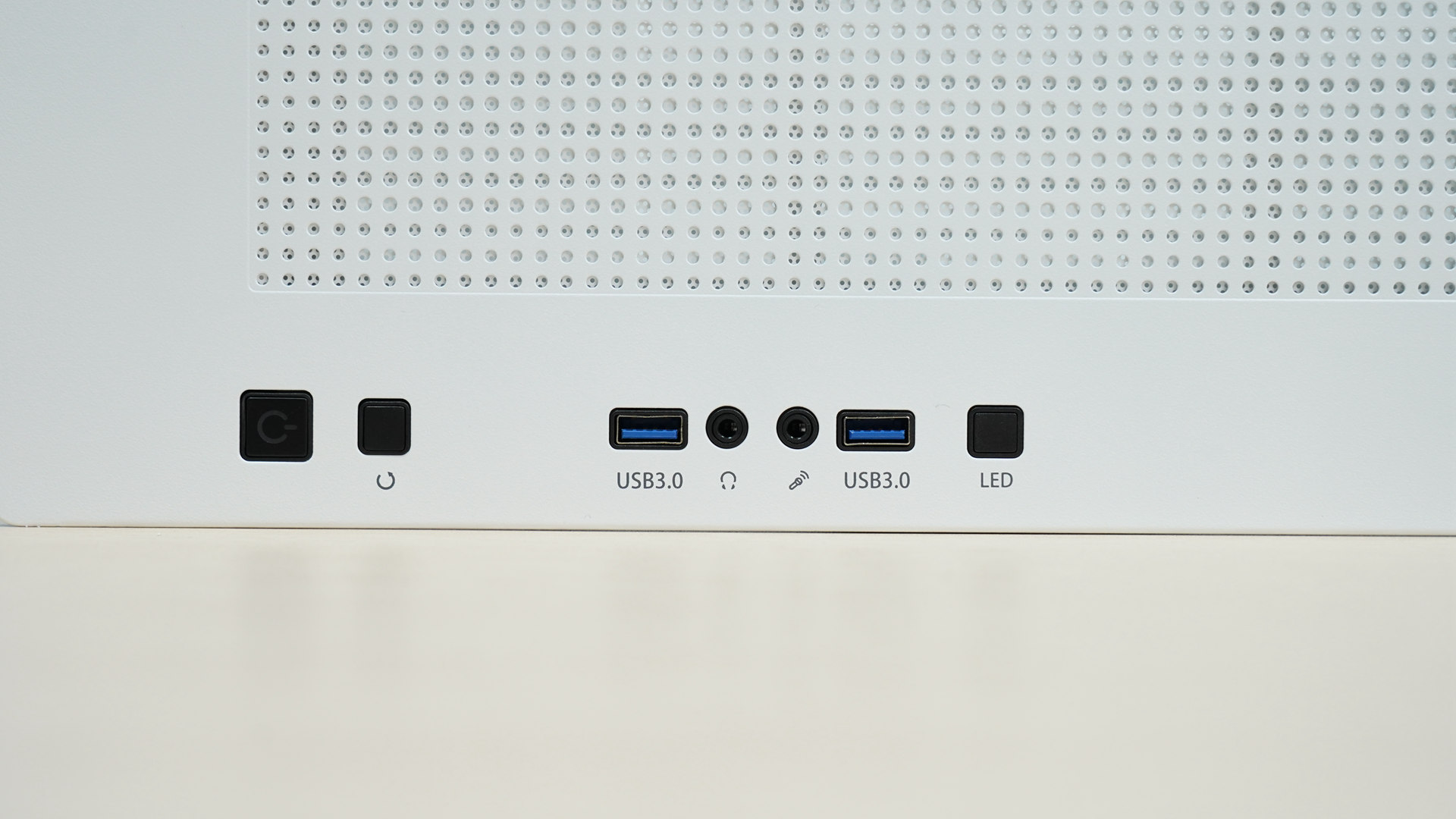 为了让机箱走线更加整洁,爱国者YOGO K200把I/O接口放置在了顶部的右侧处,它上面提供了两个USB 3.0、耳机/麦克风3.5mm音频口以及LED控制键,接口数量和种类完全可以满足到日常使用的需求。